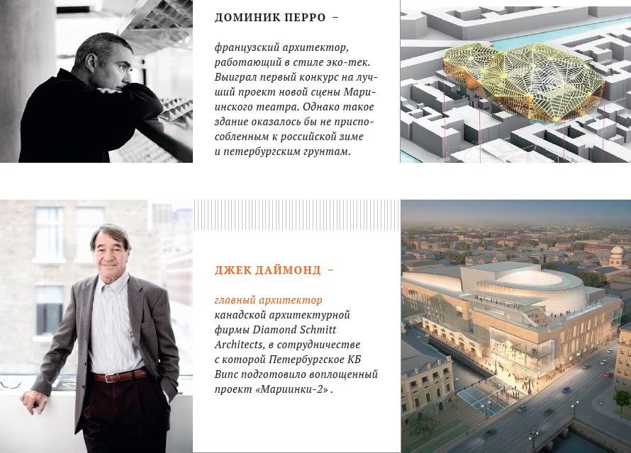 Долгожданное открытие «Мариинского-2» стало главной культурной новостью мая. Архитектурную идею нового академического театра искали буквально по всему миру. В 2003 году состоялся международный конкурс, из 11 работ лучшим признали проект французского архитектора Доминика Перро. Если бы в итоге его идея была воплощена, город получил бы многогранник, накрытый золотым куполом. Однако затейливая «крыша» не была приспособлена к снежной российской зиме, а здание целиком – к петербургским грунтам, так что проект признали технически несовершенным. После этого конкурсы на генпроектирование, а также на проектирование фасадов и интерьеров (аудиториум, фойе, репетиционные залы и т. д.) выиграло Петербургское КБ высотных и подземных сооружении (с участием канадского архитектурного бюро DSAI – Diamond & Schmitt Architects).
