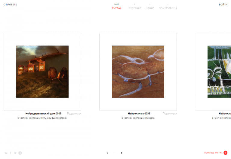 Вся галерея делится на четыре тематические раздела: «Люди», «Природа», «Город» и «Настроение». Стоит также отметить, что все картины в коллекции обязаны своему появлению на свет особой нейросети, использующей архитектуру сети StyleGAN2. Её обучение происходило на произведениях, принадлежащих к разным направлениям живописи: от фовизма и кубизма до минимализма и стрит-арта.