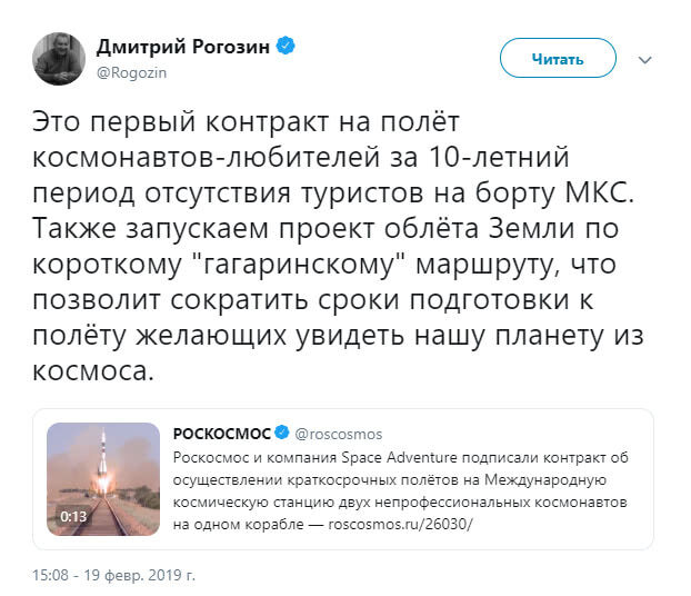 Также после перерыва в 10 лет «Роскосмос» возобновляет программу посещения космическими туристами МКС. Уже оформлены контракты на полеты двух туристов до 2021 года, но их имена госкорпорация пока не раскрыла.