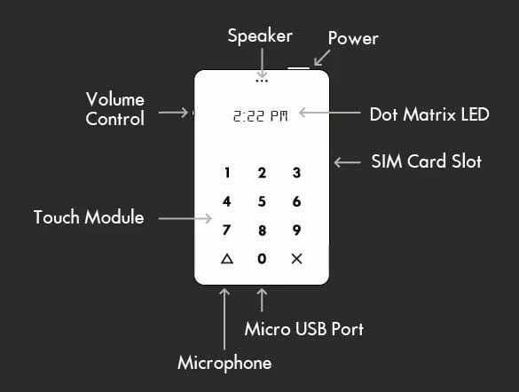 Этот телефон способен лишь звонить и принимать входящие вызовы, правда, его можно использовать еще и как фонарик (экран светодиодный, оснащен тач-клавиатурой с подсветкой для комфортного набора в темноте). Дисплей отображает только самую важную информацию — номера телефонов и текущее время. Размером «антисмартфон» c кредитную карту (85,6 × 54 × 4 мм), а весит всего 38,5 грамма.