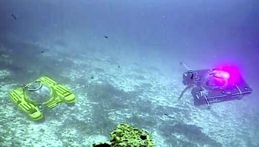 На сриншоте с видео, выпущенного Nekton, показаны два погружных аппарата с судна Ocean Zephyr во время спуска в Индийский океан близ Сейшельских островов 12 марта 2019 года. Подводные аппараты будут сражаться с сильными подводными течениями и потенциально сложными погодными условиями, когда будут обследовать склон подводной горы у атолла Альфонс. (Nekton, AP)