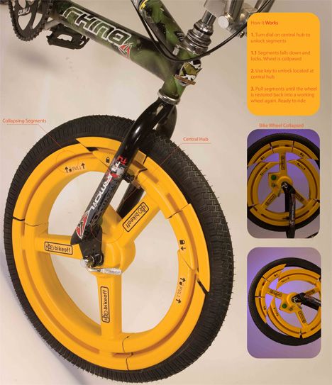 Концепт противоугонного колеса для велосипеда (идея Кармонда Лэя (Carmond Lai)) существует пока только на бумаге. Но идея прекрасная! Выглядит здорово: колесо из составных частей, поворотом специального ключа можно смещать эти сегменты так, чтобы колесо не могло выполнять свои функции.