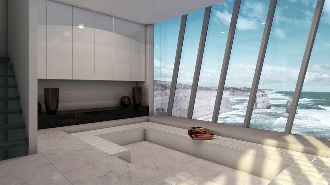 Дизайну интерьера свойствен минимализм. Согласно задумке авторов проекта жильцов ничто не должно отвлекать от панорамного вида на океан. Кроме того, пол нижнего этажа дома будет выполнен из стеклянных панелей, чтобы создать иллюзию открытого пространства, нависающего над водой. Словом, созданы все условия для того, чтобы гости этого дома могли получить порцию адреналина.