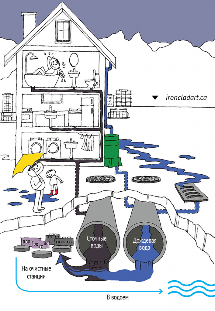 Все мы порой слышим, как шумят трубы в квартире, когда по ним спускается вода. Этот шум создают канализационные воды, загрязненные хозяйственно-бытовыми отходами, – будь то недопитый чай или содержимое унитаза. Через сифоны они проходят в в стояки (вертикальная труба вдоль всей стены), а далее через канализационные выпуски здания попадают в канализационный колодец. На этом их уютная жизнь внутри жилища заканчивается – стоки поступили в централизованную комбинированную систему водоотведения.