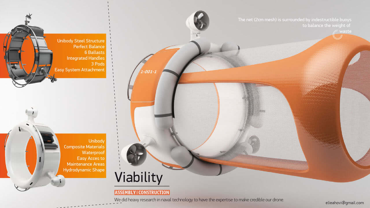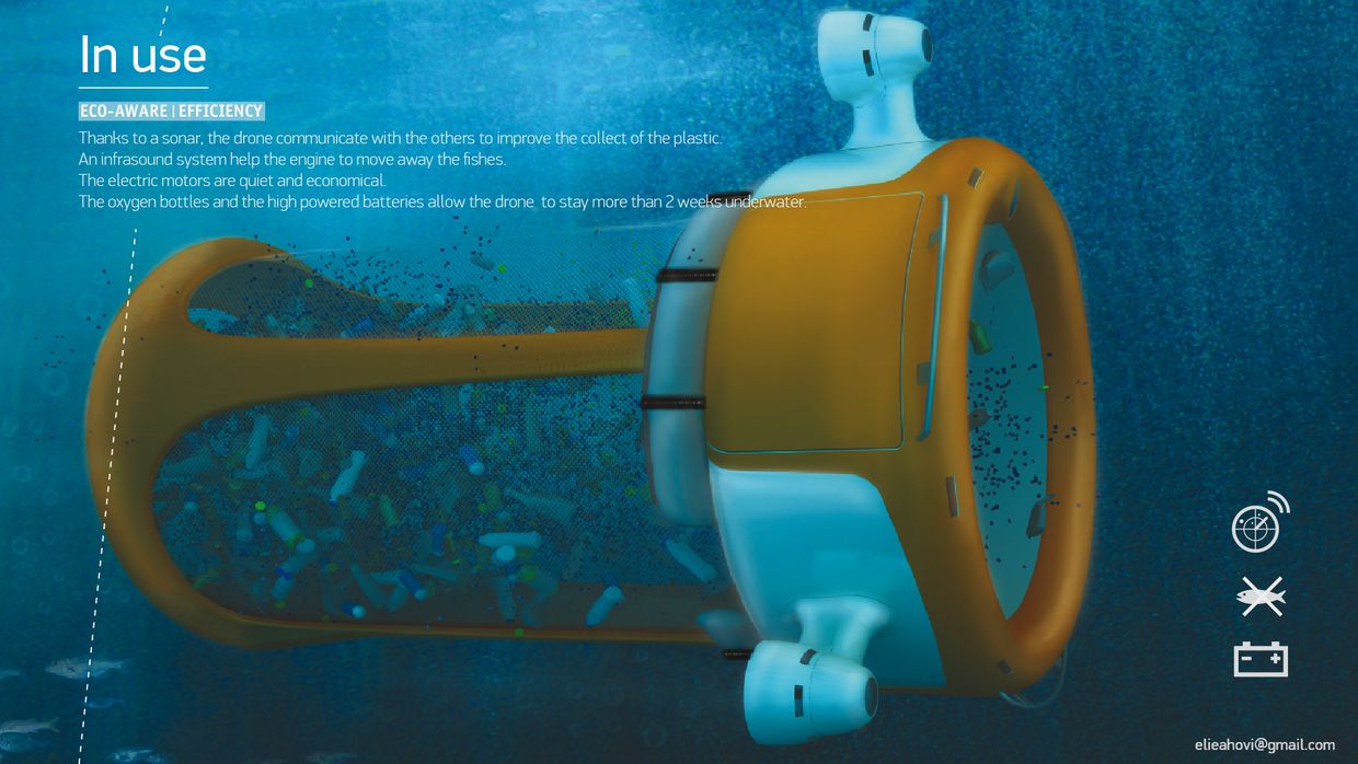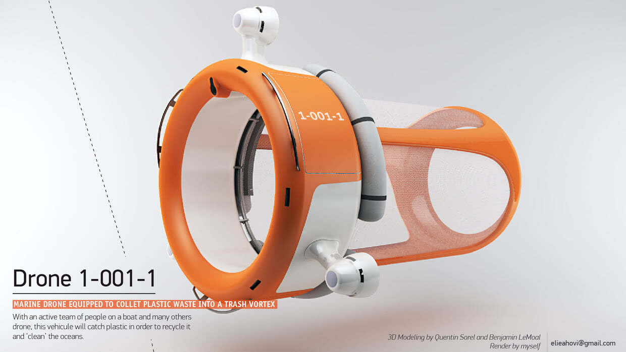 Идея и конструкция робота Marine Drone принадлежит группе их французской Международной конструкторской школы (French International School of Design), возглавляемой Эли Ахови (Elie Ahovi). Создание такого робота было необходимостью: существует Большое тихоокеанское мусорное пятно (Great Pacific Garbage Patch), котоое нужно «разгрести».