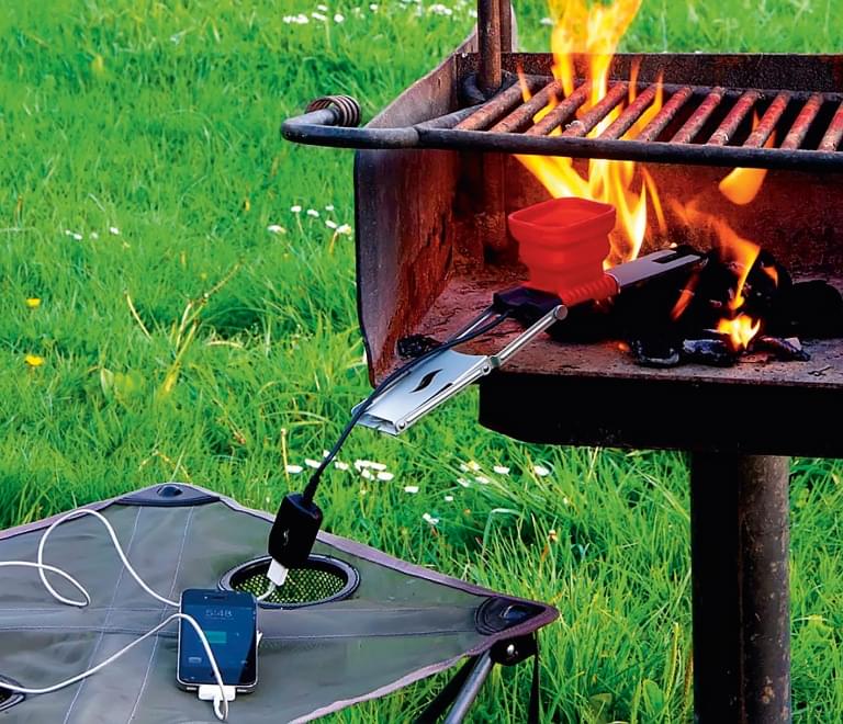 Вот парадокс: солнечные зарядные устройства уже давно популярны и доступны, а солнце все равно доступно не всегда. В пасмурную погоду есть хоть какой-то шанс зарядиться, а если ночью позарез нужен фонарик, телефон, навигатор? Тогда разводите костер и ставьте котелок! Только не любой, а, например, FlameStower. Конструкция состоит из подставки, пластины, которая нагревается над костром, и чаши для воды. Электроэнергия генерируется за счет разницы температур. В принципе, собрать такой приборчик можно и самостоятельно. Стандартная мощность устройства – 2 Вт. Пара часов у костра, и телефон заряжен.
