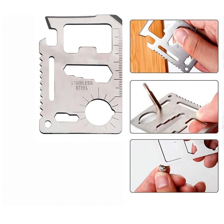 Еще одна удобная вещь в походе – ремонтная карточка-мультитул: металлическая пластинка размером с кредитку, на которой компактно размещаются отвертка, гаечный ключ, нож, открывалка и другие нужные инструменты.