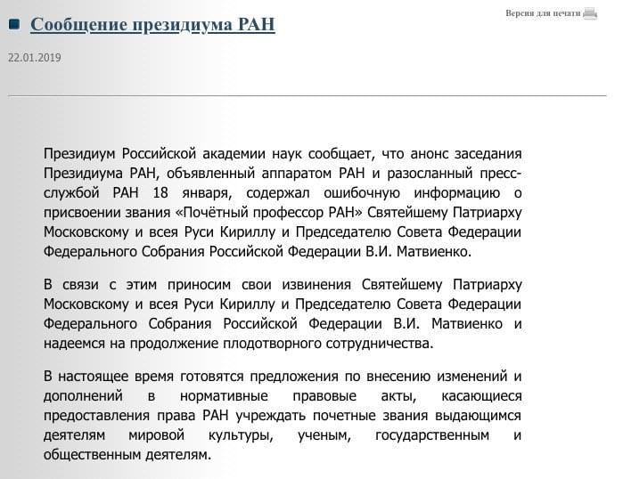 Вице-президент РАН Юрий Балега рассказал РБК, что президиум РАН 22 января исключила из повестки присвоение главе Русской православной церкви патриарху Кириллу и спикеру Совета федерации Валентине Матвиенко звание «почетный профессор РАН». По его словам, в этот день президиум будет обсуждать «целесообразность звания».