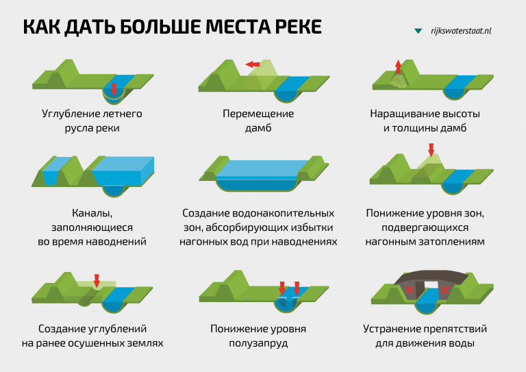 В рамках проекта «Место для реки» с побережья рек перенесли фермы и построенные ранее дамбы. Это освободило место для сбора воды в низко расположенных речных долинах, которые превратились в водохранилища и места обитания рыб и водоплавающих птиц. Такое стратегическое отступление не только снизило риск наводнений, но и позволило провести перепланировку поселений, уплотнить их и сделать более устойчивыми к стихийным бедствиям.
