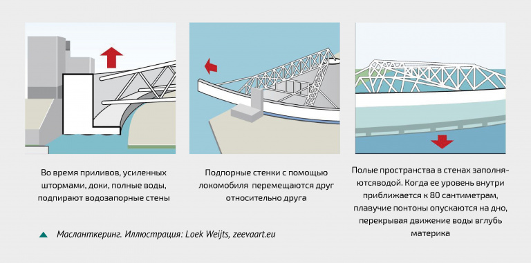 Огромные барьерные двери длиной 210 метров каждая на самом деле – полые плавучие понтоны. Во время шторма они сначала смыкаются, перекрывая фарватер, а потом наполняются водой, тонут и упираются в дно, превращаясь в массивный барьер. После того как ситуация нормализуется, вода откачивается из понтонов, которые снова всплывают и разводятся в стороны. Барьер подключен к компьютерной системе, она следит за погодой и уровнем воды, так что все эти процессы происходят в автоматическом режиме.