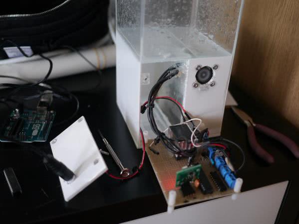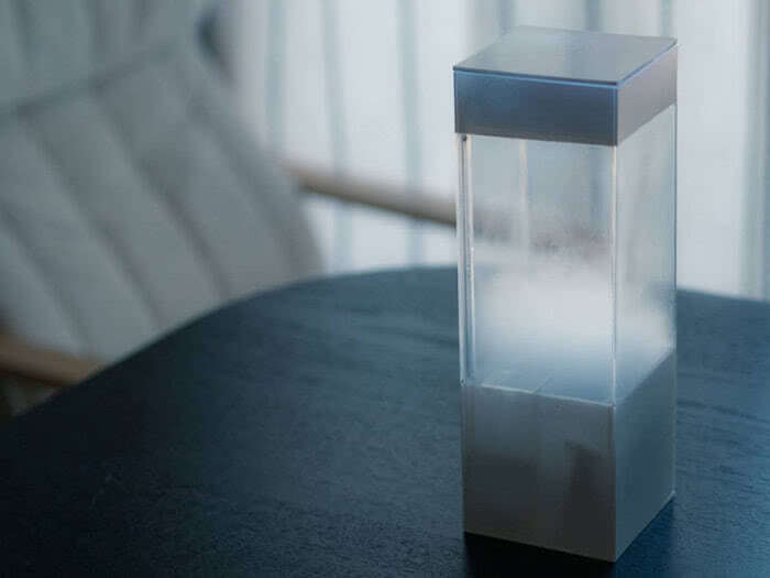 Стеклянный параллелепипед наполнен водой. Снизу и сверху расположены две «активные» поверхности, способные нагреваться, охлаждаться и впитывать влагу, находящуюся в сосуде. Кроме этого в конструкции колбы есть несколько LED светильников.