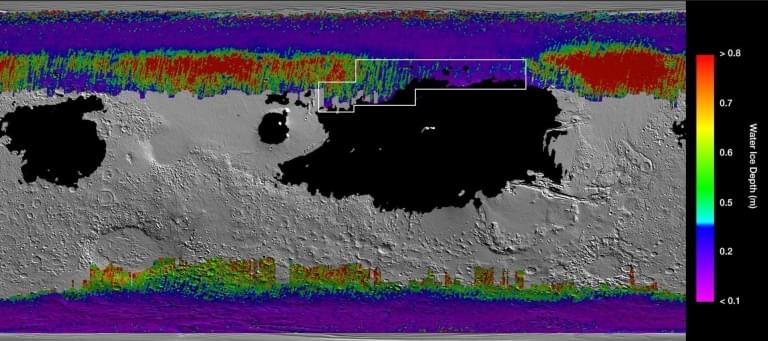 Исследователи создали карту поверхности Марса, на которой показано, где, как они полагают, находится водяной лед. В некоторых местах лед расположен на глубине всего 2,5 сантиметра, что делает его легко доступным для будущих посетителей планеты. Холодными цветами обозначен лёд, который находится ближе к поверхности, в то время как тёплыми цветами показаны залежи льда, расположенные на более серьёзной глубине.«Чтобы выкопать этот лед, экскаватора не понадобится. Вы можете использовать лопату. Мы продолжаем собирать данные о льде на Марсе, попутно подыскивая лучшие места для потенциального приземления астронавтов», — говорит Сильвен Пикё из Лаборатории реактивных двигателей НАСА, автор карты.