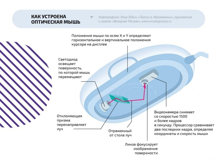 Вскоре появились оптические мыши, пережившие три жизненных этапа. Сначала в них встраивали контактные датчики, считывающие информацию о перемещении манипулятора «напрямую», без механических составляющих. С одной стороны, ими стало удобно пользоваться, имея возможность крутить курсором и так и сяк. А с другой – требовался специальный коврик со штриховкой, и как только он слегка загрязнялся, все удобство заканчивалось.