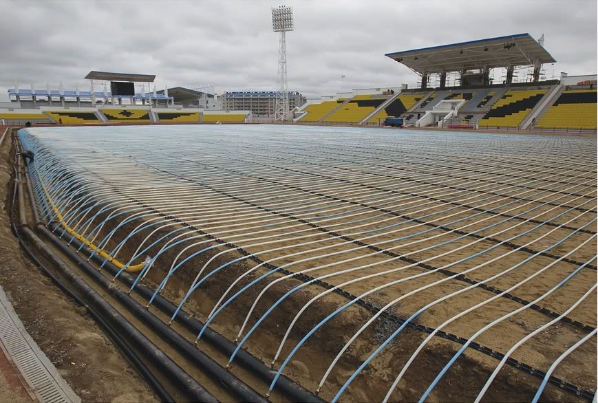 Как бы то ни было, этот способ нашел своих поклонников – тепловой кабель экономичнее, быстрее нагревается и остывает. Жидкостный подогрев действует проще – на «Петровском», как, впрочем, и на большинстве подобных сооружений, выбрали именно его. Он представляет собой систему трубопроводов, проложенных на глубине 25 см под футбольным полем и заполненных теплоносителем – раствором этиленгликоля. В результате при подогреве над почвой образуется тепловая воздушная подушка, и мороз не причиняет вреда газону. Температура рабочего теплоносителя небольшая, в таких условиях корневая система растений вполне может существовать.