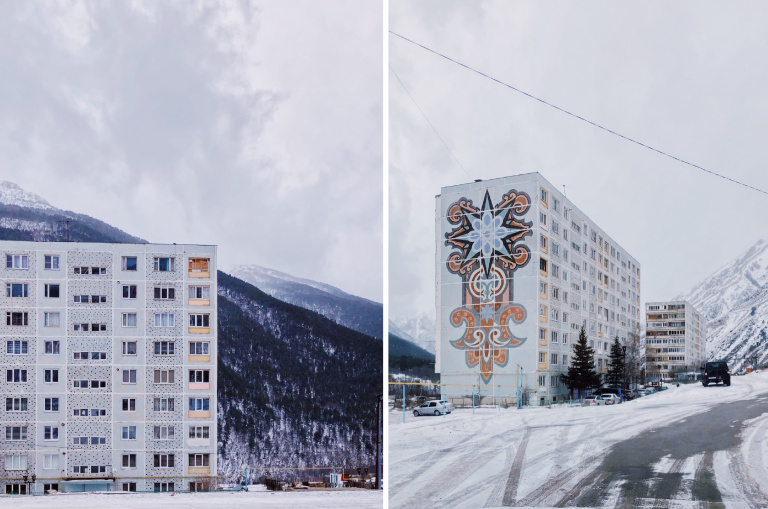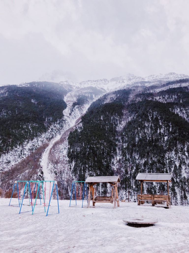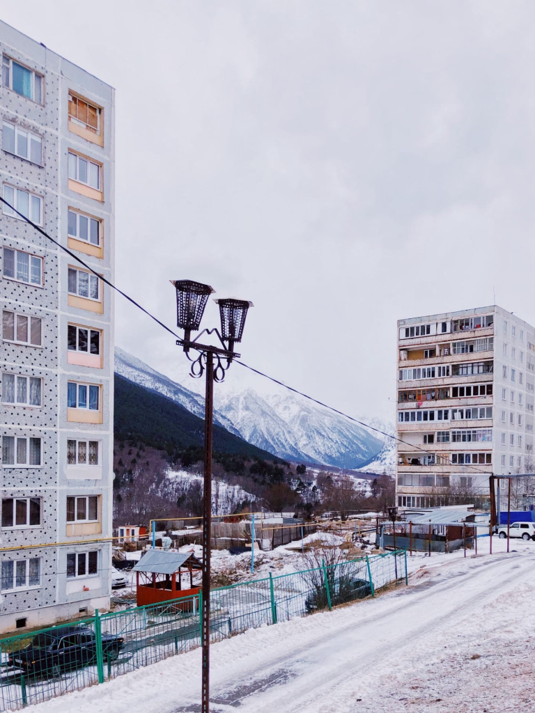 Потому что весь этот унылый и привычный до боли пейзаж здесь – располагается на фоне величественнейших гор. Что создает непередаваемую атмосферу сюрреализма. Супер-красиво-природное на контрасте с супер-убого-искусственным. Прямые углы на контрасте с криволинейностью естественного. Детская площадка с лучшим видом, парковка с лучшим видом. Любая убогая мелочь, и то будет с лучшим видом.