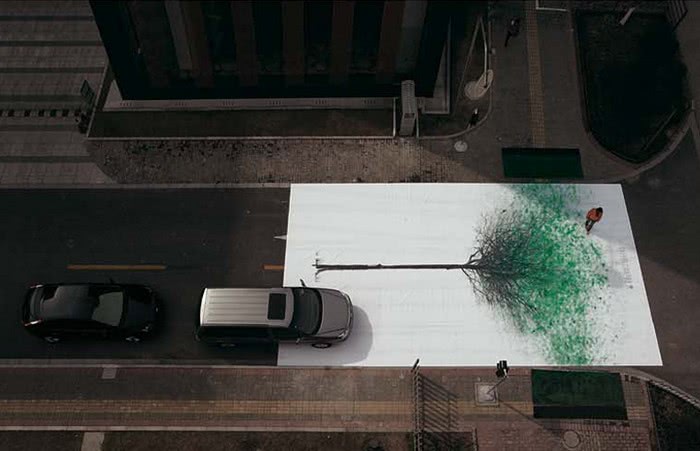 Огромное полотно, на котором нарисовано дерево без листьев, было размещено на пешеходном переходе в оживленной части города. На тротуаре закреплен небольшой коврик, покрытый зеленой краской. Желая перейти на противоположную сторону, пешеход подходил к краю тротуара, попутно потоптавшись по этому коврику и испачкав краской подошву ботинок. И топал дальше, оставляя на белом полотне зеленый след. Так один за другим у дерева и появлялись листья, в результате формирующие пышную зеленую