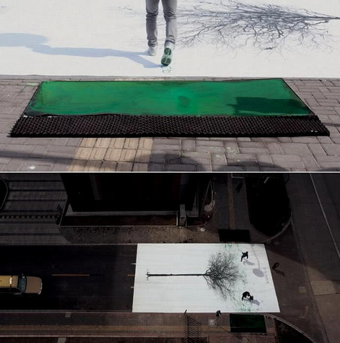 Огромное полотно, на котором нарисовано дерево без листьев, было размещено на пешеходном переходе в оживленной части города. На тротуаре закреплен небольшой коврик, покрытый зеленой краской. Желая перейти на противоположную сторону, пешеход подходил к краю тротуара, попутно потоптавшись по этому коврику и испачкав краской подошву ботинок. И топал дальше, оставляя на белом полотне зеленый след. Так один за другим у дерева и появлялись листья, в результате формирующие пышную зеленую крону.