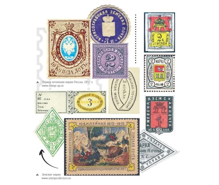 В России первые марки появились 10 декабря 1857 года. Они стоили 10 копеек, и на них изображался государственный герб. Через семь лет произошла реформа, после которой в стране заработала земская почта. В каждом из 162 уездов стали выпускаться свои марки, которые должны были отличаться от государственных, поэтому дизайн их был максимально разнообразным. Марки различались не только рисунками, но и размерами, формой, некоторые имели корешки, которые отрывались при гашении. Такого разнообразия не было больше нигде в мире, и сегодня русские земские марки очень ценятся филателистами.