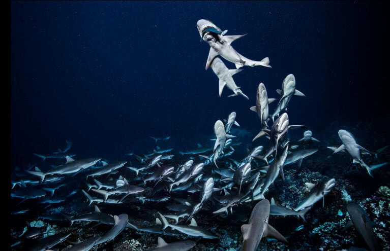 Ночью серые рифовые акулы охотятся сообща на южном канале Атолла Факарава, в архипелаге Туамоту. Команда дайверов Лорана Баллеста, ныряющая без клеток или оружия, насчитала 700 акул. Фото Лорен Балеста.