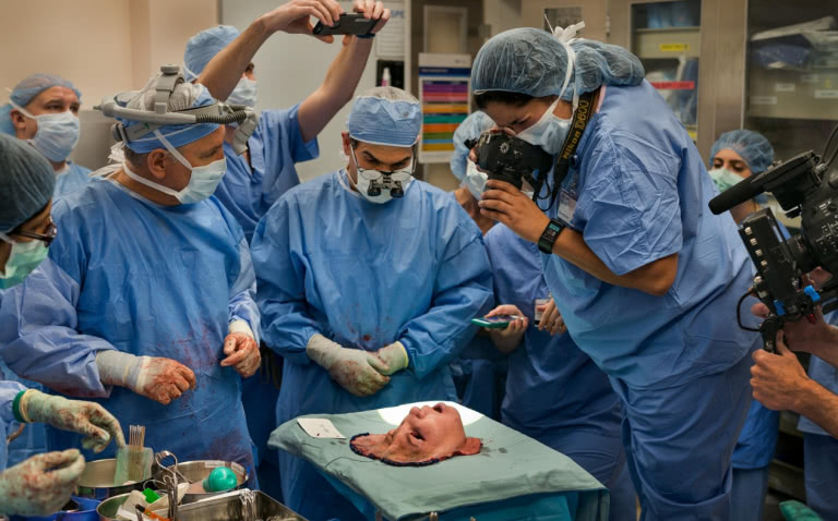 После шестнадцати часов операции по пересадке в Кливлендской клинике в Огайо, хирурги завершают сложную задачу удаления лица от донора органа. Команда молчит, пока сотрудники фотографируют лицо между двумя его жизнями. Хирурги потратили еще 15 часов на лицо Кэти Штубфилд. Фото Лин Джонсон.