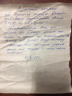 Послание написали от руки моряки, которые служили в Дальневосточном пароходстве, в то время являвшейся подразделением Русского флота. На пожелтевшей от старости бумажке написаны пожелания нашедшему: крепкого здоровья, долголетия и «долгого плавания». Также моряки просят сообщить о находке по адресу: гор. Владивосток, ВРХФ (Востокрыбхолодфлот), плавательная база Сулак.