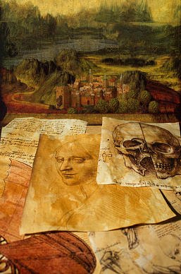 Для меня Леонардо да Винчи - это сплав технологии и искусства. Поэтому сразу было решено отталкиваться от его работ. Хотелось передать незримое присутствие гения. Так, были выбраны чертежи и наброски, как бы намекающие на скорое возвращение к работе. Процесс состаривания и придачи текстуры бумаге производился при помощи 4 пакетиков чая) Завершали работу подбор соответствующего освещения, сама непосредственная съемка композиции и дальнейшее объединение с задним планом.
