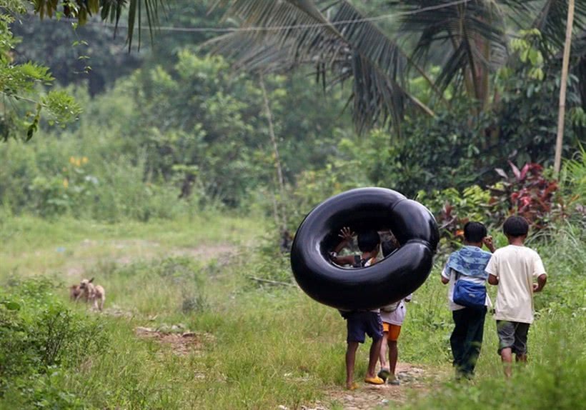 Дети преодолевают реку на накачанной шине, Ризал, Филиппины