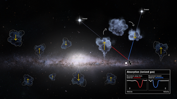 Спектрограф Хаббла (COS) изучает процессы поглощения и излучения света, а также умеет определять температуру, химический состав, скорость и плотность объектов. С помощью COS исследователи наблюдали за движением газовых облаков в нашей Галактике. Если газ удаляется дальше, то облако выглядит красным, а если приближается, то голубым. Таким образом команда увидела, что у нас намного больше «голубого» газа, нежели «красного».