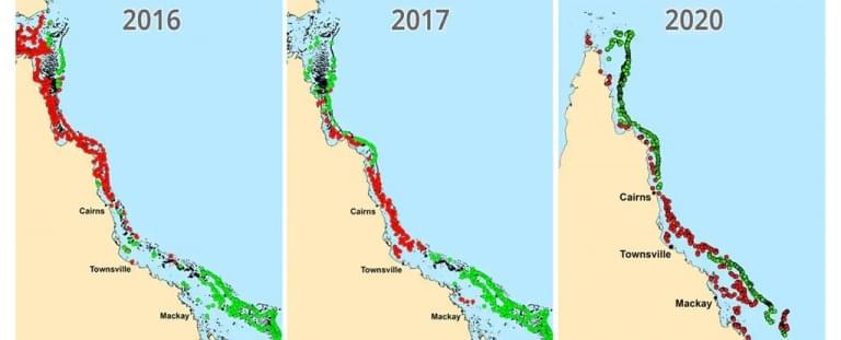 Неотбеленные и слегка обесцвеченные рифы в 2020 году преимущественно находятся недалеко от края континентального шельфа в северном и южном Большом Барьерном рифе. Сильно обесцвеченные рифы расположены в центральном регионе и недалеко от берега: от Торресова пролива на севере до южной границы Морского парка Большого Барьерного рифа.