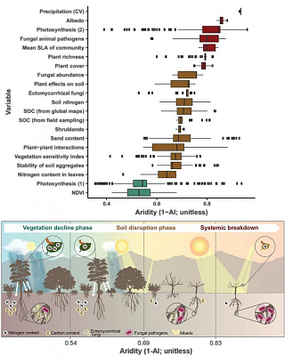 Экосистемы засушливых земель, занимающие 41% поверхности Земли и являющиеся домом для примерно трети ее населения, рискуют претерпеть серьёзную деградацию из-за изменения климата. Изучение эмпирических данных впервые показало, что это может привести сначала к резкому снижению способности растений фиксировать углерод из атмосферы, затем к существенному снижению плодородия почвы и, наконец, к исчезновению растительности.