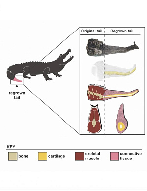 Междисциплинарная команда исследователей с помощью передовых методов визуализации изучила анатомию и тканевую организацию заново отращенных хвостов. Оказалось, что эти новые хвосты представляют собой сложную структуру с центральным скелетом и состоят из хрящей, окруженных соединительной тканью. Ткань, в свою очередь, пронизана кровеносными сосудами и нервами. Ученые предполагают, что отращивание хвостов дает аллигаторам функциональное преимущество в условиях мутной водной среды обитания.