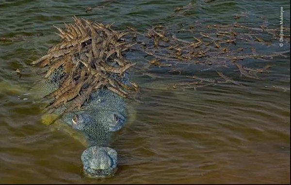 Гавиаловые крокодилы – они же гангские гавиалы – достигают 4,5 метров в длину и весят более 900 кг. Свое название они получили по луковицеобразным выступам, которые присутствуют на конце морды самцов («gharas» на языке хинди означает «грязевой котел»). С помощью этих выступов крокодилы усиливают голосовые сигналы, а в сезон спаривания – пускают пузыри. По словам автора снимка, изображенный на нем самец спаривался с 7 или 8 самками, которые и принесли ему столь многочисленное потомство – более 100 детенышей.