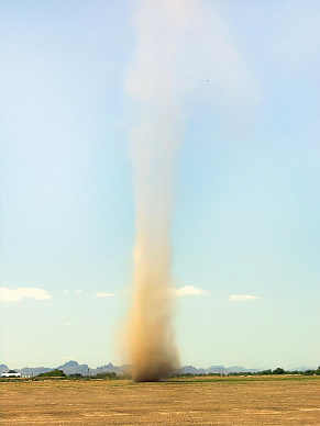 Относительная влажность воздуха здесь редко перешагивает порог в 20–30 %. Голая земля раскаляется от прямых солнечных лучей. От нее так же сильно нагревается нижний слой воздуха. Формируется резкая граница между перегретым приземным воздухом и более прохладным, лежащим выше. Иногда она срабатывает как зеркало, отражающее небо, и рождает миражи. Но такие иллюзии неустойчивы, потому что неустойчив сам слой воздуха, нагретого до 40–50 °С. Зато внезапные завихрения воздуха вызывают к жизни другое частое явление пустынь – кружащиеся на месте столбы пыли. Их называют «танцующие джинны».