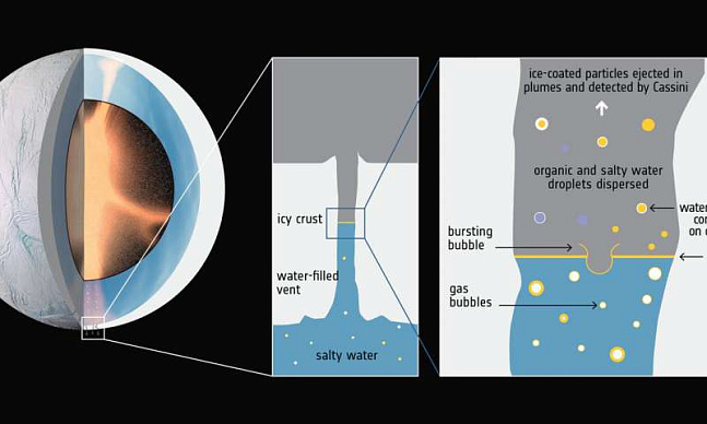 В соответствии с данными "Кассини" Энцелад имеет глубокий соленый океан под ледяной коркой поверхности, простирающийся до горячего пористого скального ядра. На поверхности Энцелада обнаружены грандиозные гейзеры, высвобождающие смесь водяного пара и ледяных зерен из океана в пространство через трещины, прозванные «тигровыми полосами». Эти выбросы обеспечивают материал для одного из колец Сатурна.