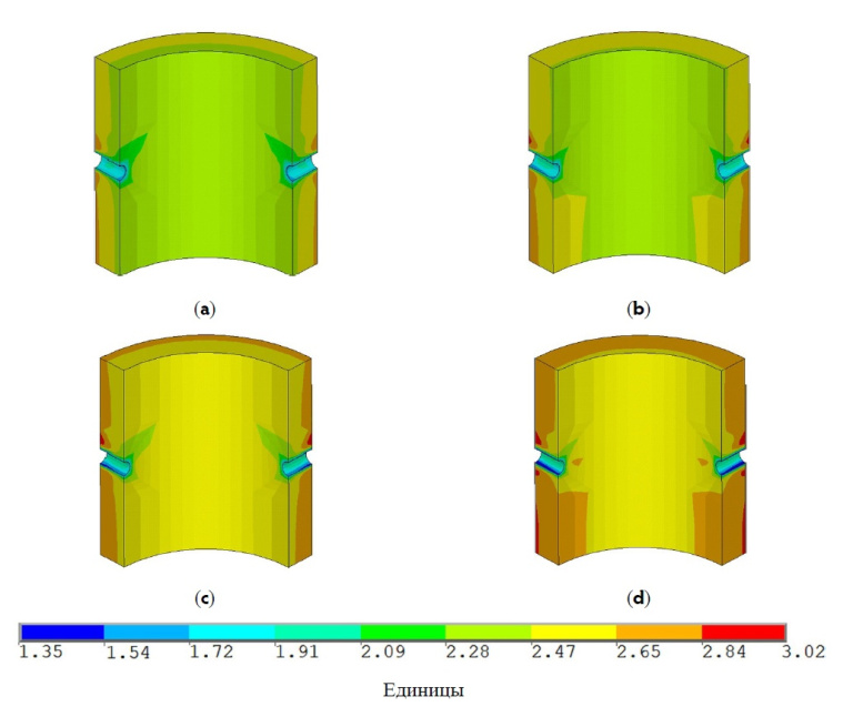 Коэффициент безопасности цементного камня при просадке перепада давления 0 МПа (a), 3 МПа (b), 6 МПа (c) и 9 МПа (d). Фото: пресс-служба ПНИПУ