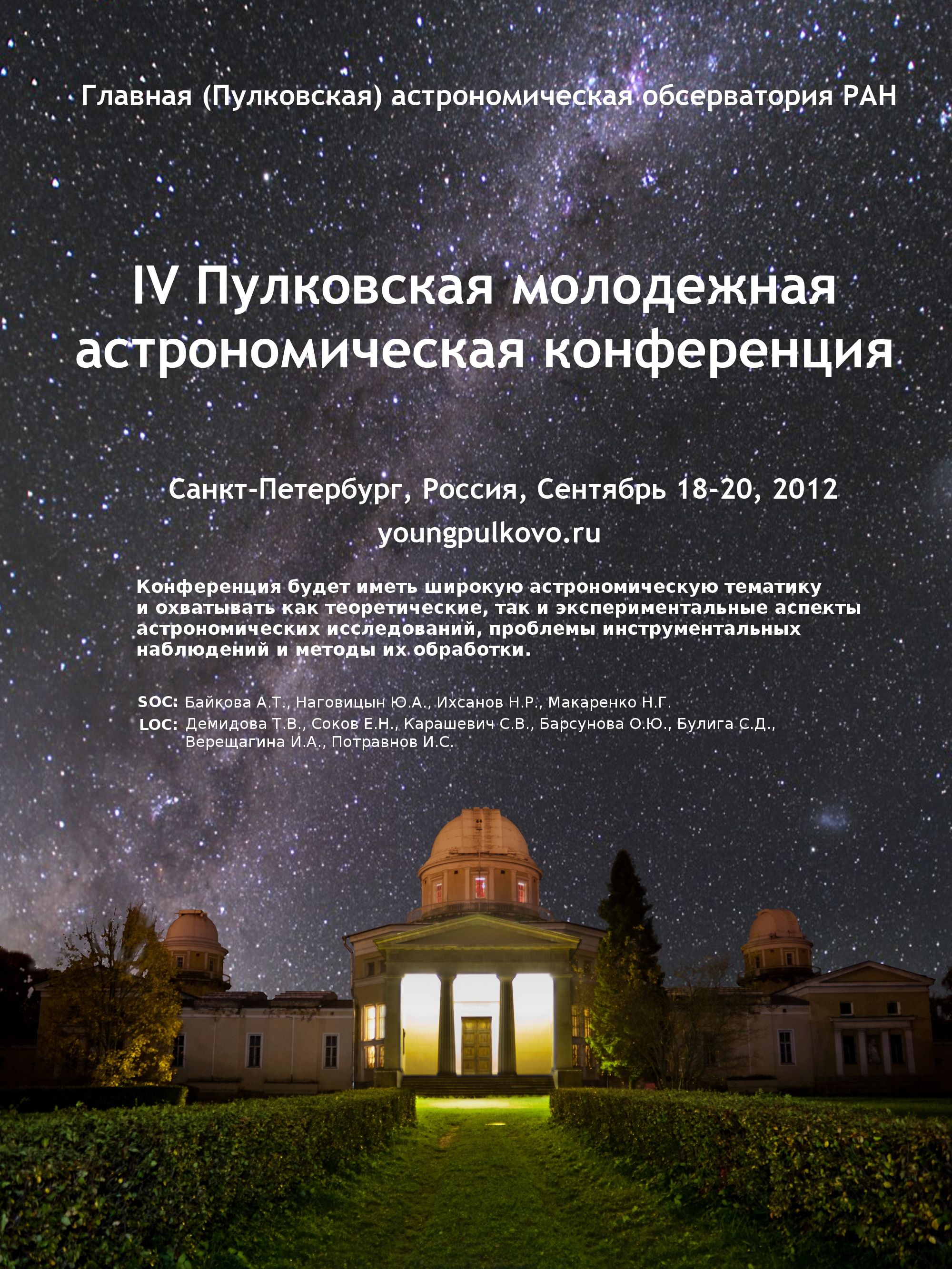 C 18 по 20 сентября будет проходить IV Пулковская молодежная астрономическая конференция. Среди участников: молодые ученые (до 35 лет), аспиранты и студенты различных научных и образовательных организаций Российской Федерации.