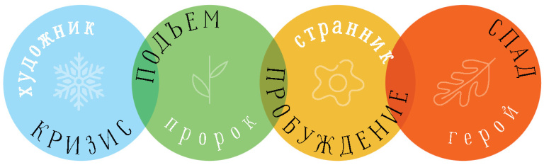 Их названия, которые мы упомянули выше, продиктованы их сутью, и каждое – имеет свое «настроение», которое Штраус и Хау назвали «сезонами истории». Пробуждение они сравнили с летом, а Кризис – с зимой (оба этих периода называются превращениями и характеризуются тем, что люди, их пережившие, наблюдали исторические события, которые сильно изменили их социальную среду). Подъем и Спад – переходные сезоны вроде осени и весны.