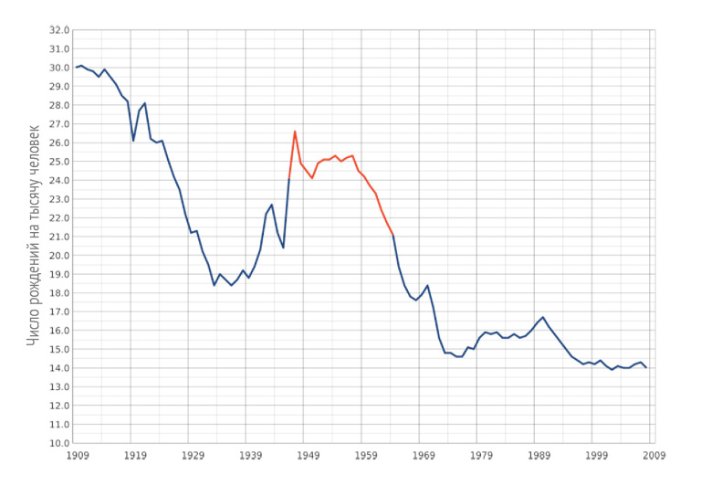 Рождаемость в США с 1909 по 2009 г. Красный сегмент обозначает период бэби-бума. График: Nwbeeson, commons.wikimedia.org
