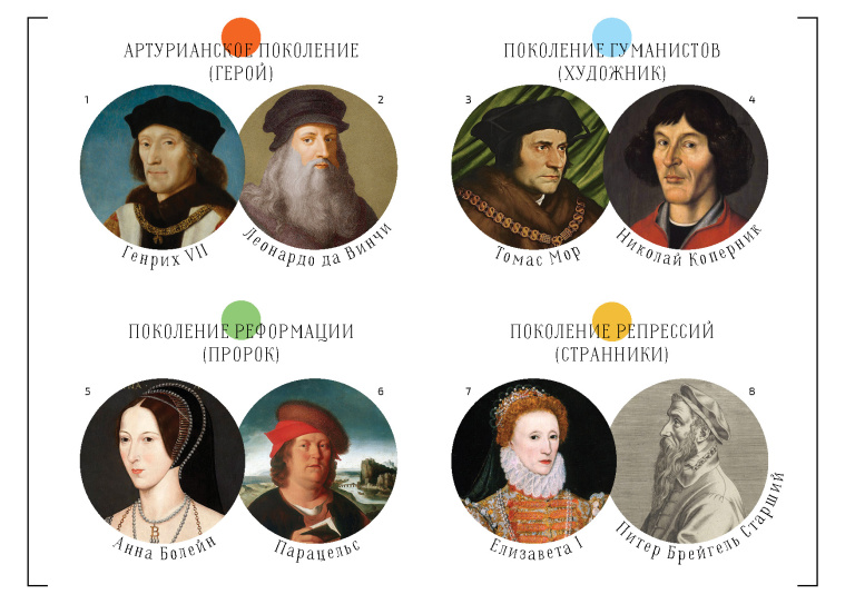 Изучив американскую историю, исследователи выявили 26 «превращений» за семь циклов с 1433 года до нынешнего времени. Первым поколением англо-американской истории, которое выделили Штраус и Хау, стало артурианское – время героев, относящееся к 1433–1460 годам, когда в Англии наблюдался Спад – окончание Столетней войны: серии военных конфликтов между королевством и Францией. Следующее поколение – гуманистов (художников) – сформировалось в эпоху другой войны – Алой и Белой розы между группами английской знати. Дальше – пророки, рожденные в период с 1483 по 1511 год, в эпоху английского Ренессанса. Время странников пришло в эпоху реформации католической церкви – в 1512–1540 годах. Эти циклы повторялись по кругу, в том числе и в XX веке.