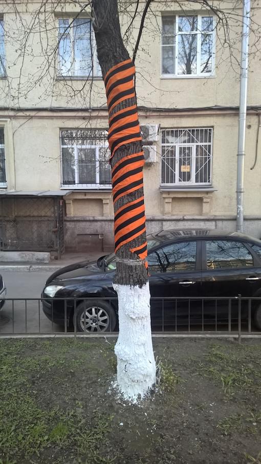 В Санкт-Петербурге недалеко от станции метро «Электросила» предприимчивые коммунальщики украсили дворы ко Дню Победы. В нескольких дворах за домами 170 и 172 по Московскому проспекту все деревья обернули в огромные георгиевские ленты.