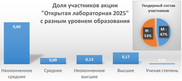 8 ноября более 3000 россиян в десятках городов и населенных пунктов страны проверили свою научную грамотность на площадках просветительской акции «Открытая лабораторная». В этом году организаторы не предлагали новых вопросов – участникам было предложено ответить на лучшие вопросы «Открытых лабораторных» прошлых лет. Традиционно основными участниками акции стали школьники (60%), на втором месте по представленности были студенты (22%), далее – люди с высшим образованием (17%) и ученой степенью (1%). Гендерный состав участников был чуть смещен в женскую сторону (53%).