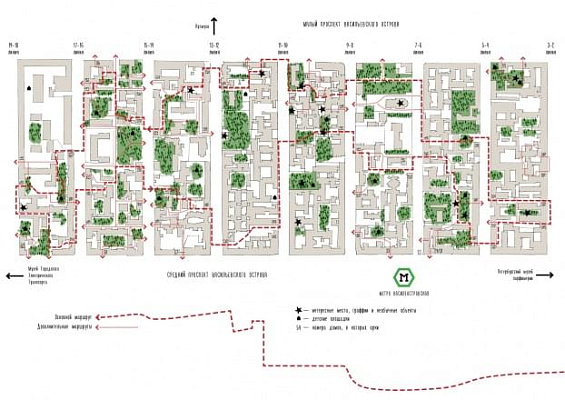 Архитектор Екатерина Новикова из Санкт-Петербурга сделала четвертую карту из своей серии «Проходные дворы». Карта посвящена Васильевскому острову и на ней понятно и доступно отмечено, как быстро и удобно добираться до нужных мест, не выходя на оживленные улицы Васильевского острова. Всего маршрут составляет 5 километров.