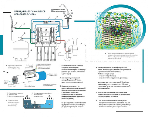 Выход нашелся в мембранных технологиях, основанных на создании непреодолимого барьера на пути веществ, не относящихся к типу H2O. Тончайшие пленки, собранные в рулоны, способны к уникальной микрофильтрации – не пропускать даже случайно попавшие в воду вирусы. Настоящим хайтеком в индустрии бытовой водоочистки стал способ с привлечением обратного осмоса, который мы помним ещё из школьного курса физики. Идея и проста, и сложна одновременно. Специальная мембрана, проницаемая только для воды, пропускает её из менее насыщенного солями раствора в раствор, богатый подобными солями, – это и есть явление осмоса. Если давление в насыщенном солями растворе увеличить, то вода пойдет в обратном направлении, то есть из насыщенного в бедный солями раствор. Чувствуете, о чем идет речь? Это же отличный механизм молекулярной очистки воды, причем таким образом можно даже море превратить в пресный водоем. И обратноосмотические установки уже завоевали мир – они используются в пищевом производстве для повышения концентрации соков, стерилизуют воду для медицины и перерабатывают бытовые стоки до класса чистой питьевой воды на гигантских круизных лайнерах.