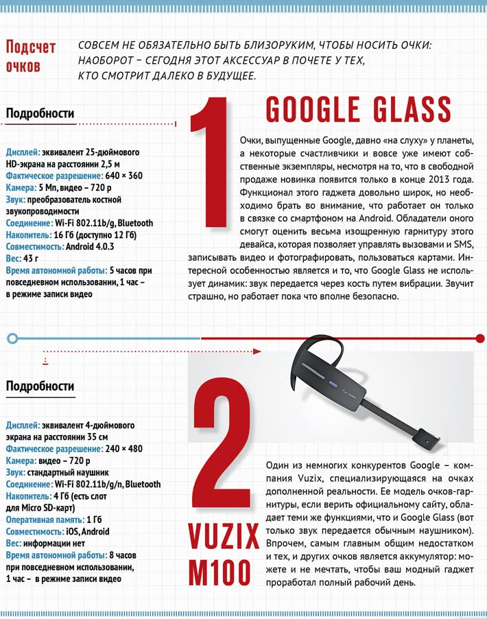 Широким ассортиментом носимые гаджеты пока похвастаться не могут, но ведь и мобильные телефоны поначалу считались диковинными устройствами. Правда, скептики уже обнаружили главную проблему высокотехнологичных аксессуаров: это… аксессуары. Заставить человека, который никогда не носил очки, надеть те же самые Google Glass – не самая простая задача. То же самое касается часов: сам гендиректор Apple Тим Кук (Timothy Cook) отметил на одной из конференций, что сегодня редко встретишь двадцатилетнего молодого человека с наручными часами (что, однако, не мешает компании говорить о перспективах iWatch). К тому же далеко не каждый решится надевать странный и далеко не классический аксессуар с офисным костюмом или вечерним нарядом. Но если посмотреть немного шире и включить все эти часы, очки, браслеты в общую линию развития вычислительной техники и тенденции к миниатюризации устройств, то можно предположить, что следующим шагом станет вживляемая техника – причем не в медицинских целях, а именно в потребительских. Гибкие экраны, микросхемы-татуировки, контактные линзы с датчиками – все это уже широко обсуждается. Что будет через двадцать лет? Станет ясно в ближайшие десять.
