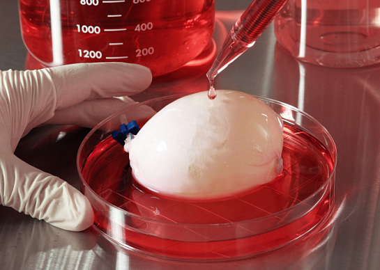То есть выращиваемому органу нужен какой-то костяк, трехмерная платформа, «строительные леса». Это должна быть пористая структура, к которой клетки могли бы легко прикрепляться и переползать с места на место, и чтобы их можно было легко «кормить» и снабжать разными регуляторными молекулами, направляющими развитие в нужную сторону. По мере роста клетки будут строить собственный каркас, выделяя во внешнюю среду белки и другие молекулы межклеточного вещества, которые поддерживают ткань, – значит, наш искусственный каркас должен вовремя раствориться, деградировать. И конечно, материал для «лесов» должен быть биосовместимым – то есть не вредить самим клеткам.