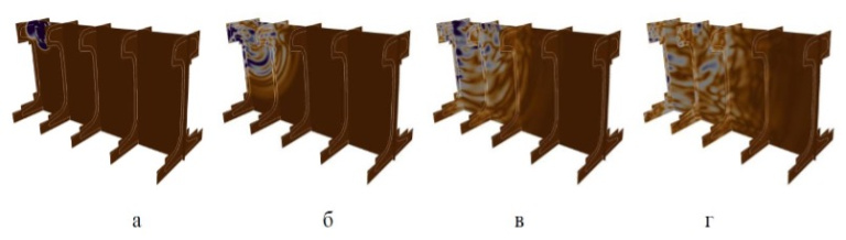 Рисунок 2. Моделирование ультразвукового контроля рельса. На серии изображений показана динамика распространения упругой волны (цветом обозначена скорость смещения частиц) по фрагменту железнодорожного рельса в разные моменты времени (а – 0,252 мкс, б – 1,677 мкс, в – 3,355 мкс, г – 5,032 мкс). Точное компьютерное моделирование позволяет увидеть, как волны взаимодействуют со сложной геометрией профиля и потенциальными внутренними дефектами, что крайне важно для разработки эффективных методов неразрушающего контроля и обеспечения безопасности на транспорте. Источник: Акустический журнал РАН. Инновационность работы заключается в систематическом исследовании и сравнении различных стратегий применения Химерных сеток именно для задач теории упругости. Если ранее этот метод активно применялся в аэродинамике для расчета потоков вокруг самолетов, то его адаптация для геологических и материаловедческих задач потребовала разработки новых алгоритмов. Теперь у исследователей есть своего рода «меню» опций, из которого можно выбрать наиболее подходящую модификацию метода в зависимости от специфики задачи: будь то большое количество трещин в породе или сложная топография поверхности.