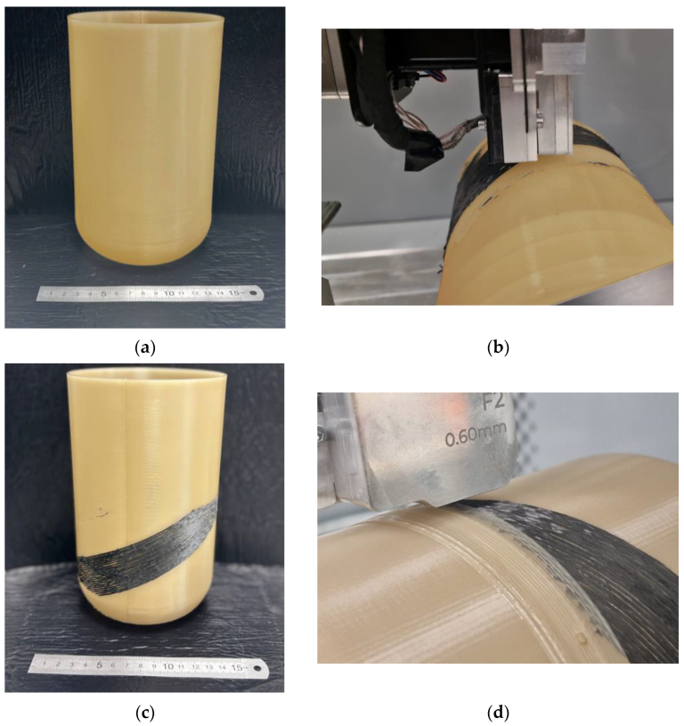 Этапы изготовления прототипа гильзы: (a) тонкостенный цилиндр из PA12, напечатанный на 3D-принтере; (b) нанесение углеродных стержней по заданным траекториям; (c) прототип с нанесенными углеродными стержнями; (d) герметизация стержней и восстановление толщины стенок с помощью дополнительных слоев PA12. Фото: пресс-служба ПНИПУ