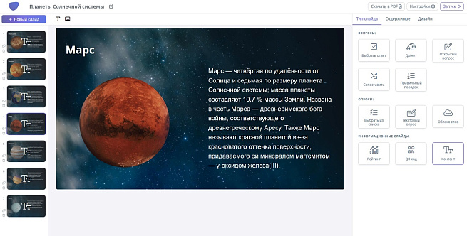 Отечественная платформа ученого ПНИПУ позволит разнообразить стандартный и привычный интерфейс презентаций яркими интерактивными форматами с большим функционалом. Это выводит обучение и выступления на новый уровень, когда аудитория становится не только слушателем, но и вовлеченным в процесс участником двусторонней коммуникации. Такой подход повышает качество усвоения новой информации.