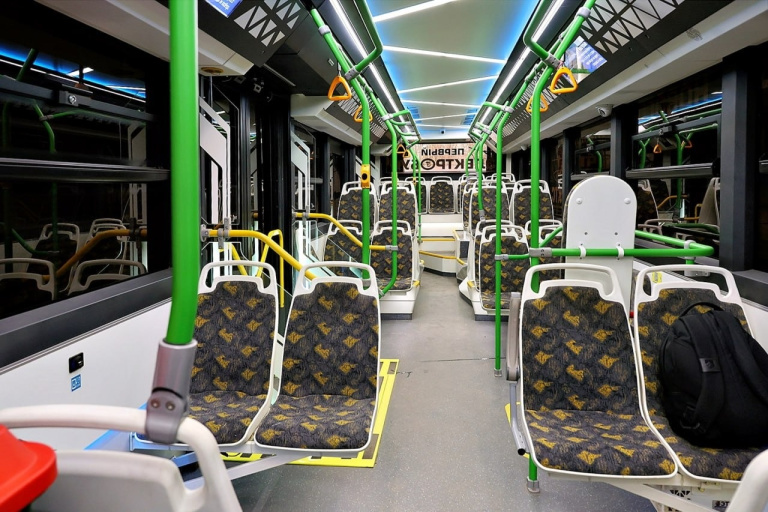 Для комфорта пассажиров в салоне работает система климат-контроля, информационные медиапанели и USB-зарядки для гаджетов. А низкий пол электробуса делает возможными поездки для маломобильных пассажиров.